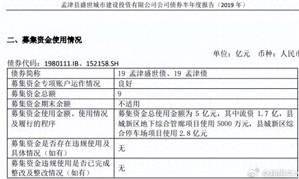据募集说明书显示, 2019年4月10日发行的 “19孟津盛世债”募集资金9亿元,其中 7.3 亿元拟用于孟津城新区地下综合管廊建设项目、孟津城新区综合停车场建设项目等民生工程项目。据2019年半年债券财报显示,截止当年6月底用于综合停车场2.8亿元。