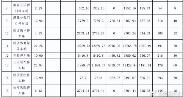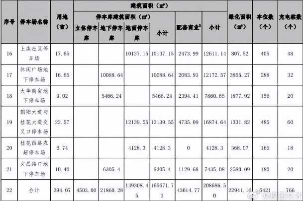 据募集说明书中显示,《各停车场建设内容及规模汇总》中序号为17的休闲广场地下停车场规划占地16.65亩,车位数288个,充电桩32个;序号为18的大华商贸地下停车场占地9.02亩,车位数156亩,充电桩20个;序号为21的文昌路口地下停车场占地10.4亩,车位数180个,充电桩20个。