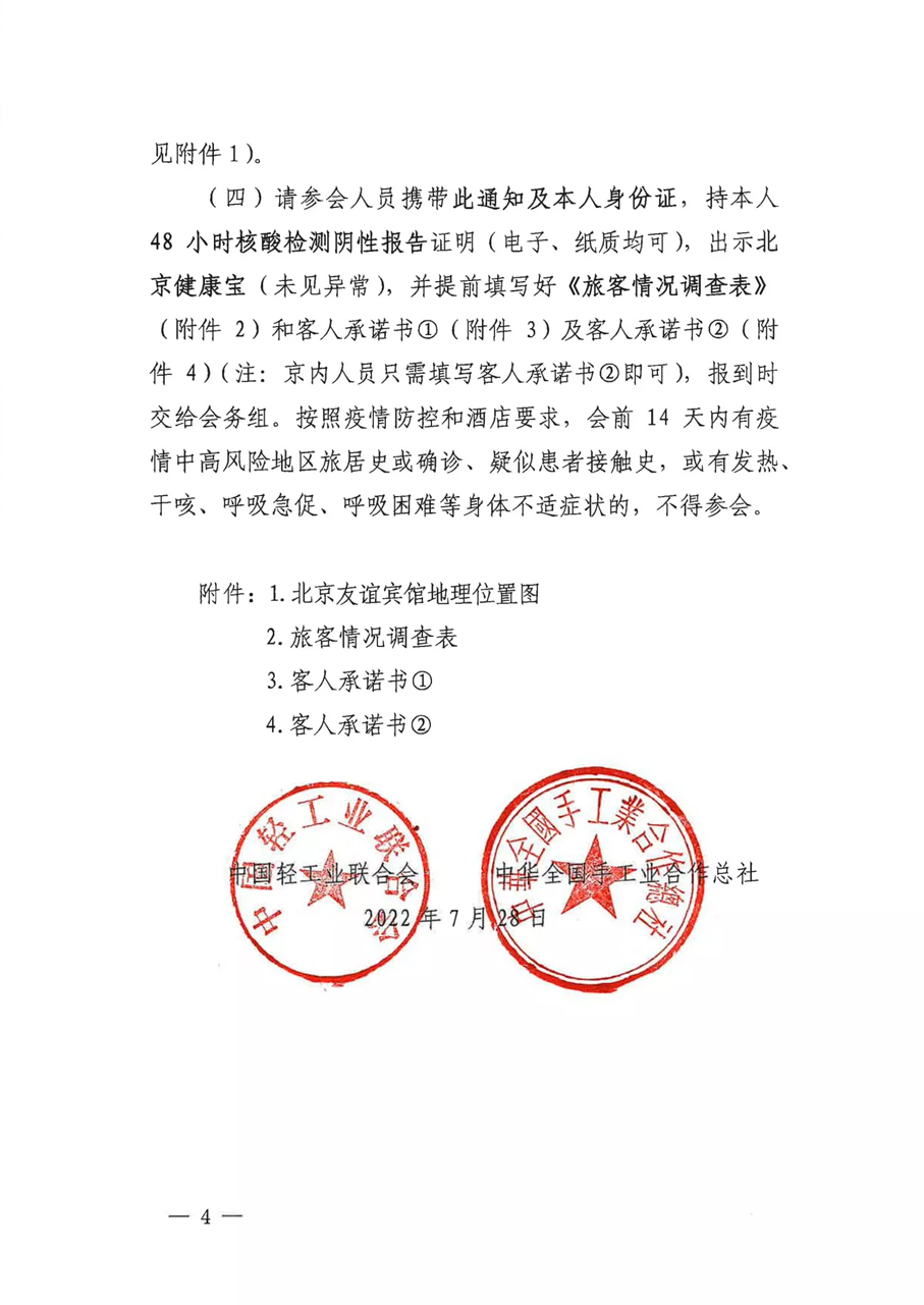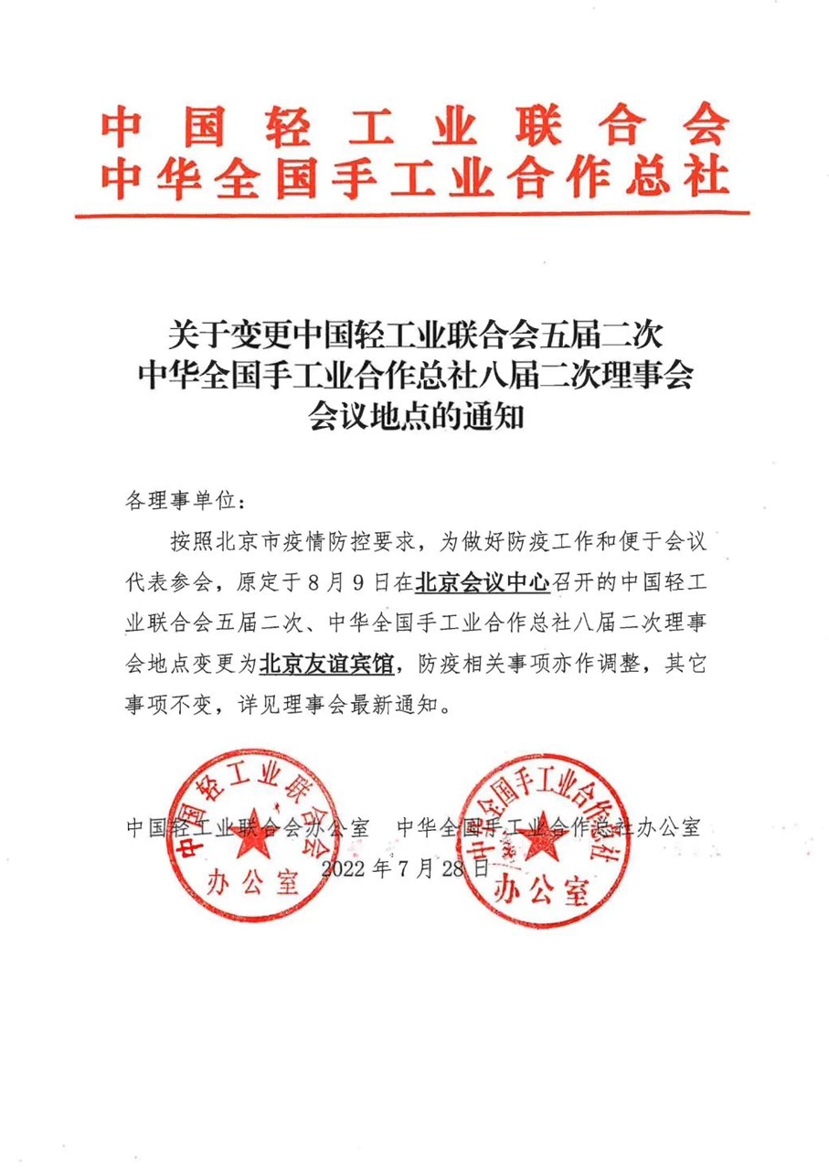 按照北京市疫情防控要求,进一步做好会议服务保障工作,便捷代表参会,原定于8月9日在北京会议中心召开的中国轻工业联合会五届二次、中华全国手工业合作总社八届二次理事会地点变更为北京友谊宾馆。